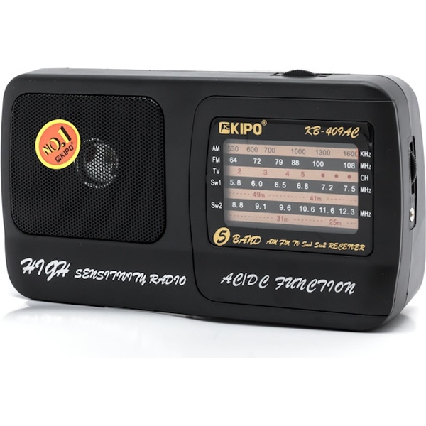 Радиоприемник переносной KIPO KB-308А, аналоговый тюнер AM / SW / FM / TV тюнер с возможностью приема на телевизионных каналах. основные параметры частотный диапазон: AM: 530-1600 кГц FM: 64-108 МГц TV: 2-5 Канал SW1: 5.8 - 7.5 МГц SW2: 8.8-12.3 МГц Батарея: 2х 1.5 В Размер R20 (373), выход на наушники 3.5 мм, размеры 117 х 205 х 68 мм, вес 446 г (без батареек) Питание: АС 220 В, телескопическая антенна откидная ручка