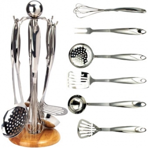 7 предметов: венчик, картофелемялка, вилка, черпак, шумовка, ложка и подставка, материал - нержавеющая сталь