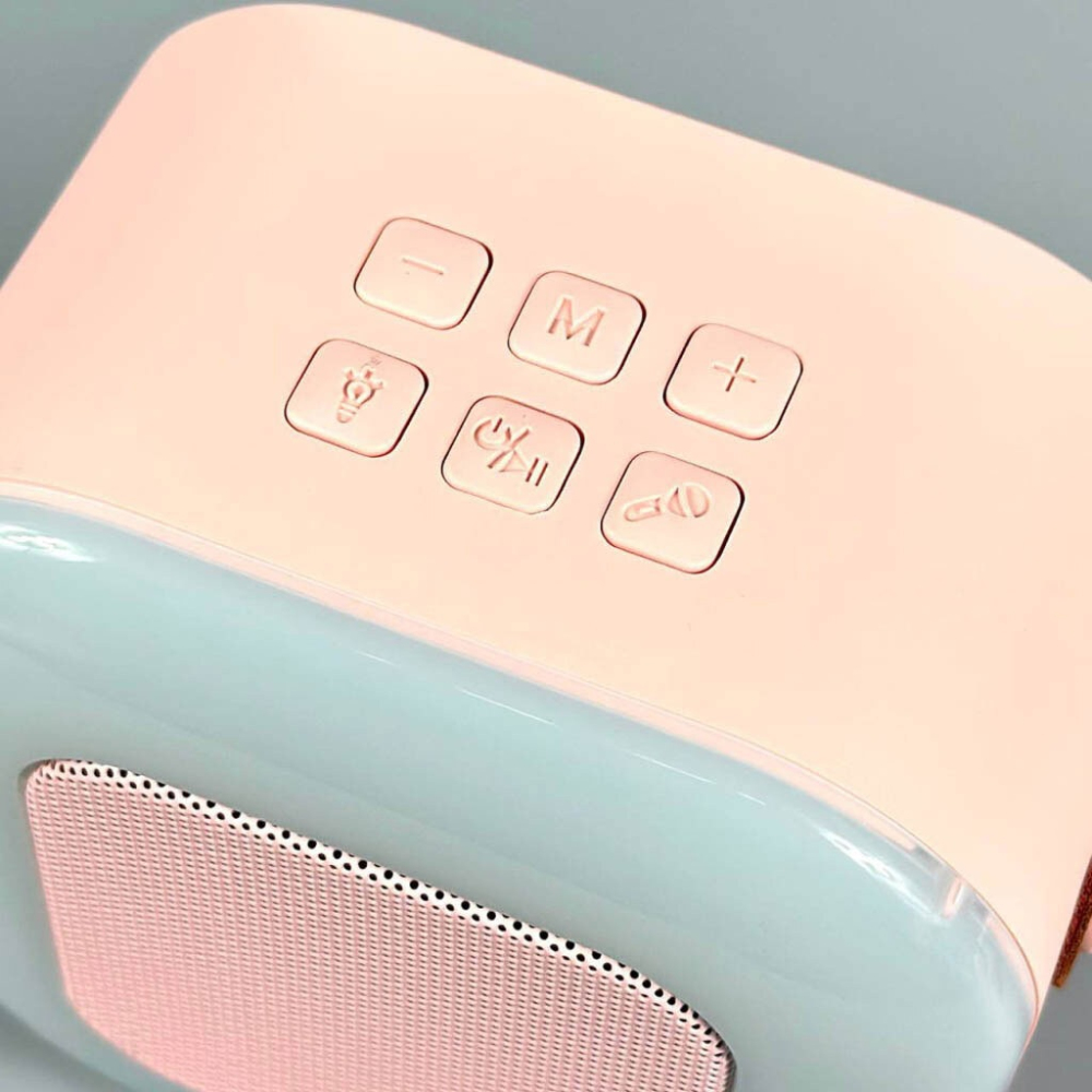 Акустика з караоке, вихідна потужність 5 Вт, розмір динаміка: 45 мм, сумісність з Bluetooth, час роботи: 1,5 год, ємність акумулятора: 800 mAh, підсвічування: RGB, в комплекті два мікрофони.