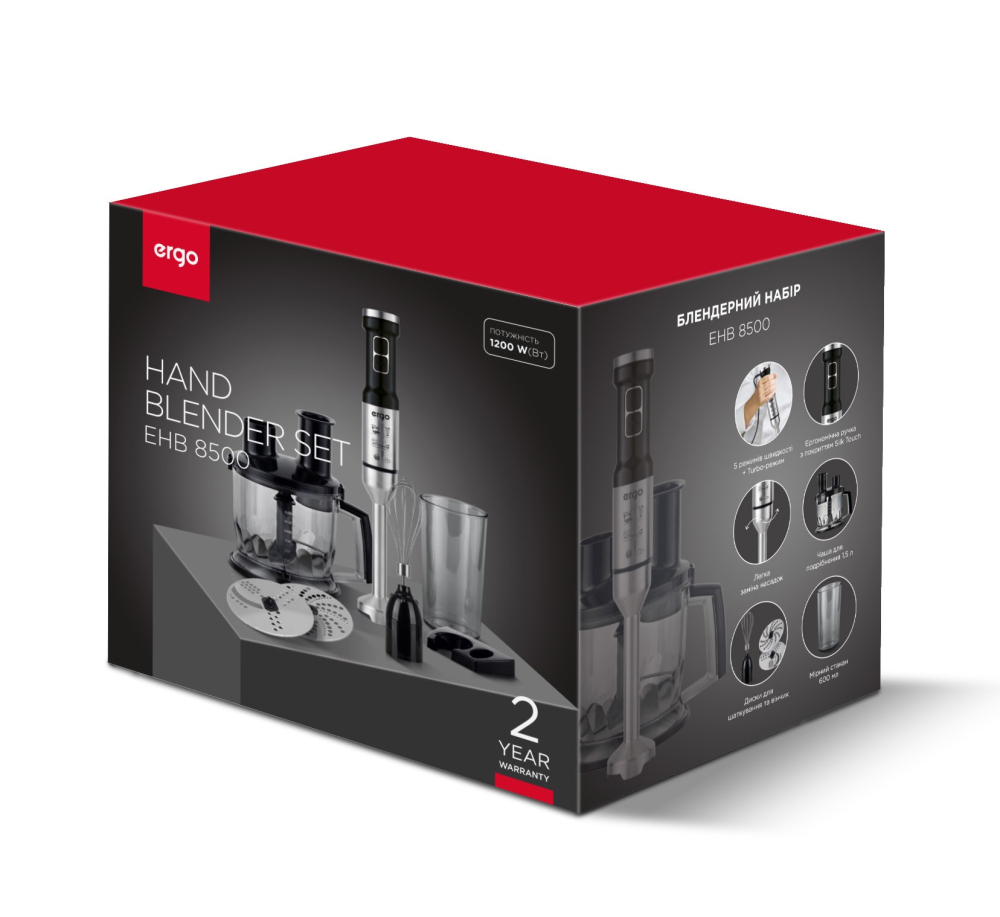 Занурювальний блендер ERGO EHB 8500 – відмінний спосіб максимально швидко та без зайвих зусиль вирішити такі рутинні задачі на кухні, як виготовлення пюре, мусів, збивання яєць, приготування коктейлів, подрібнення, шинкування та натирання овочів, фруктів тощо.
