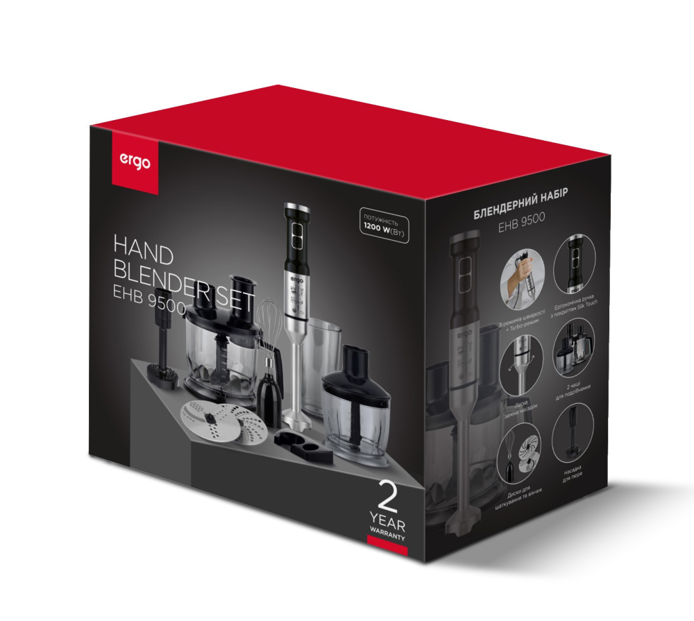 Модель ERGO EHB 9500 має високу потужність 1200 Вт, оснащена турборежимом для швидкого виконання задач та має можливість обрання однієї з 5 швидкостей для більш делікатної роботи, як-от збивання яєць чи виготовлення смузі.