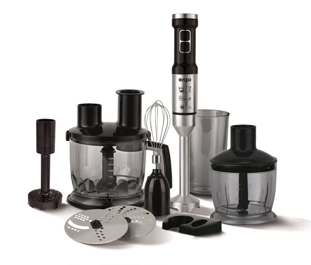 Завдяки металевому ножу-подрібнювачу занурювальний блендер ERGO EHB 9500 можна використовувати в роботі з дуже гарячими продуктами, включно з супами, пюре й соусами. За допомогою вінчика можна збивати й змішувати рідкі продукти, а декілька спеціальних насадок та одразу дві чаші з кришкою місткістю 0,6 л і 1,5 л дозволяють робити деруни, шинкувати, нарізати скибочками й дрібно натирати овочі й фрукти, а також змелювати й подрібнювати сухарі, горіхи тощо, працюючи одночасно з декількома типами продуктів.
