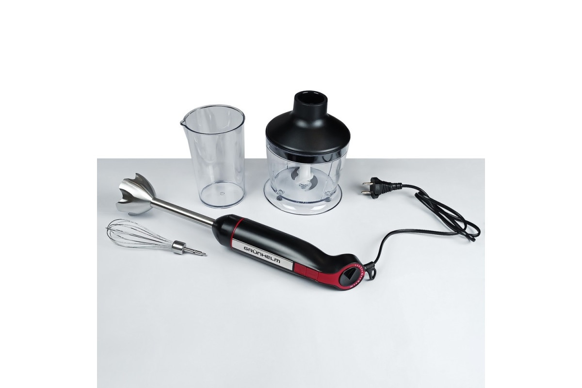 Завдяки набору насадок блендер дозволяє змішувати, збивати, робити пюре, молоть, рубати та багато іншого. Насадка блендера, ножі та міксерна насадка виконані з високоякісної сталі. Модель комплектується місткою чашею подрібнювача ємністю 500 мл та мірною склянкою 600 мл.