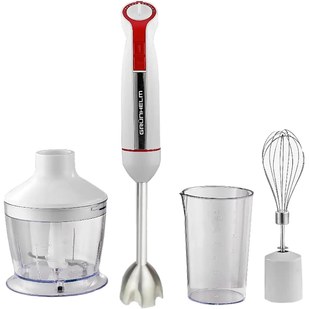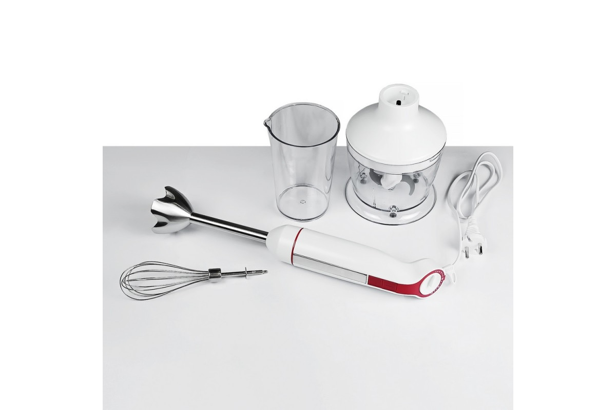 Завдяки набору насадок блендер дозволяє змішувати, збивати, робити пюре, молоть, рубати та багато іншого. Насадка блендера, ножі та міксерна насадка виконані з високоякісної сталі. Модель комплектується місткою чашею подрібнювача ємністю 500 мл та мірною склянкою 600 мл.