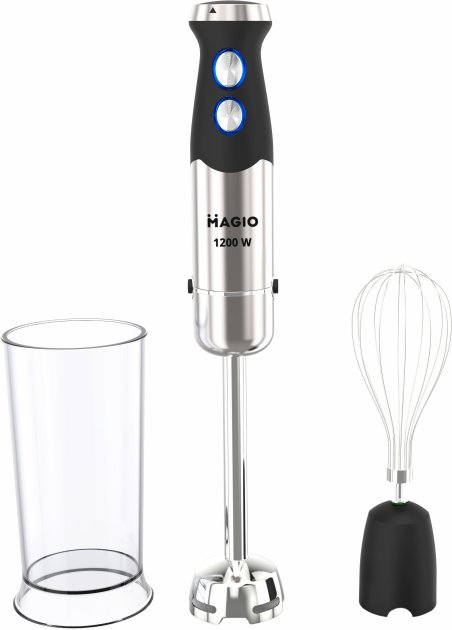 Блендерный набор MG-645 позволит вам разнообразить ваше меню и приготовить новый кулинарный шедевр. Мощность блендера составляет 1200 Вт, что обеспечивает бесшумную эффективную работу в течение длительного времени. Погружная часть выполнена из нержавеющей стали, а нож с титановым покрытием — залог устойчивости к износу и долговечности. Эргономическая рукоятка с приятным покрытием SOFT TOUCH.