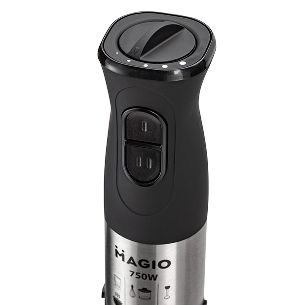Мощность 750 Вт, 2 скорости, измельчитель объемом 600 мл, материал ножки блендера: металл, рукоятка с покрытием Soft-touch