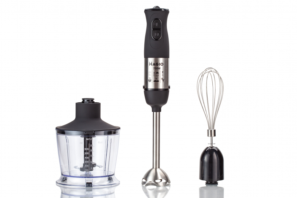 В комплект входит пластиковый мерный стакан, венчик для взбивания и мини-измельчитель объёмом 600 мл. Эти свойства в сочетании с компактным дизайном делают блендер незаменимым помощником на вашей кухне