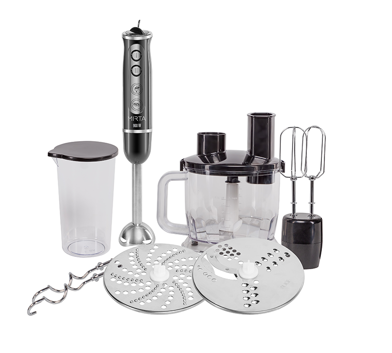 Мощность 900 Вт, 15 скоростей, турбо-режим, ножка из нержавеющей стали, чаша-измельчитель 0.6 л, венчик, насадка-миксер, терки - 2 шт, мерный стакан 0.6 л