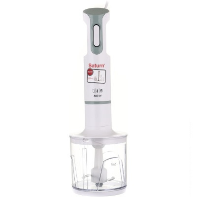 Потужність: 800Вт, 2 швидкості, ніжка з нержавіючої сталі, ножі з нержавіючої сталі, комплектація:подрібнювач (350 мл), вінчик, мірна чашка (600 мл).