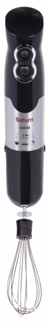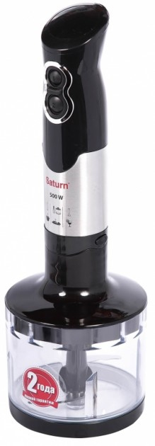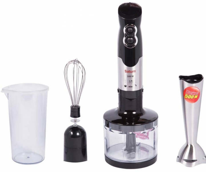 Мощность: 500 Вт, емкость стакана 600 мл, венчик, чаша измельчителя 400 мл, материал ножки блендера - металл