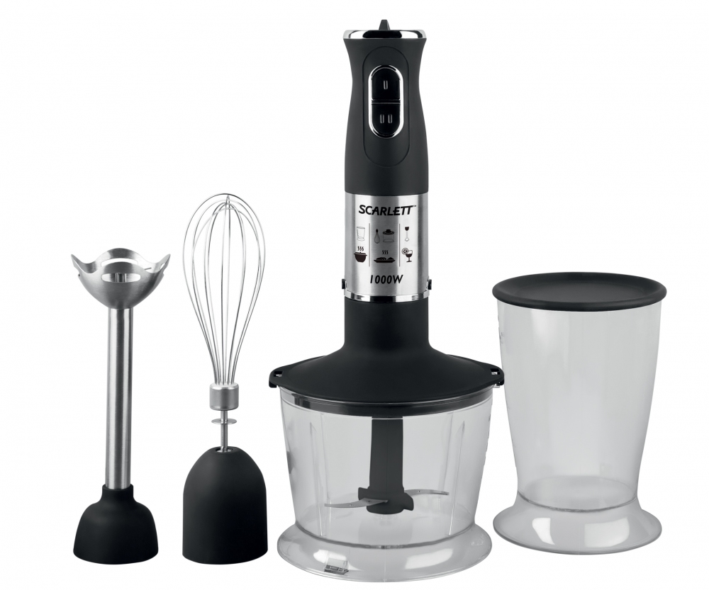 Мощность: 1000 Вт, тип блендера: погружной, импульсный режим, металлическая погружная часть, измельчитель объёмом: 0.6 л, мерный стакан: 0,5 л