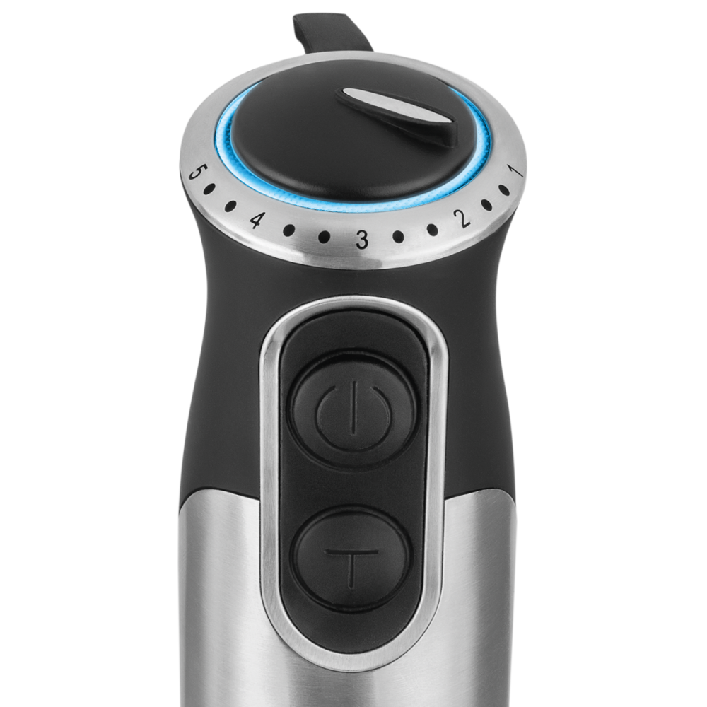 Высокая мощность 1000 Вт позволяет блендеру работать в 5 скоростных режимах, при этом эргономика ручки и переключателя продумана таким образом, что прибором удобно пользоваться одной рукой, изменяя скорость прямо во время работы.