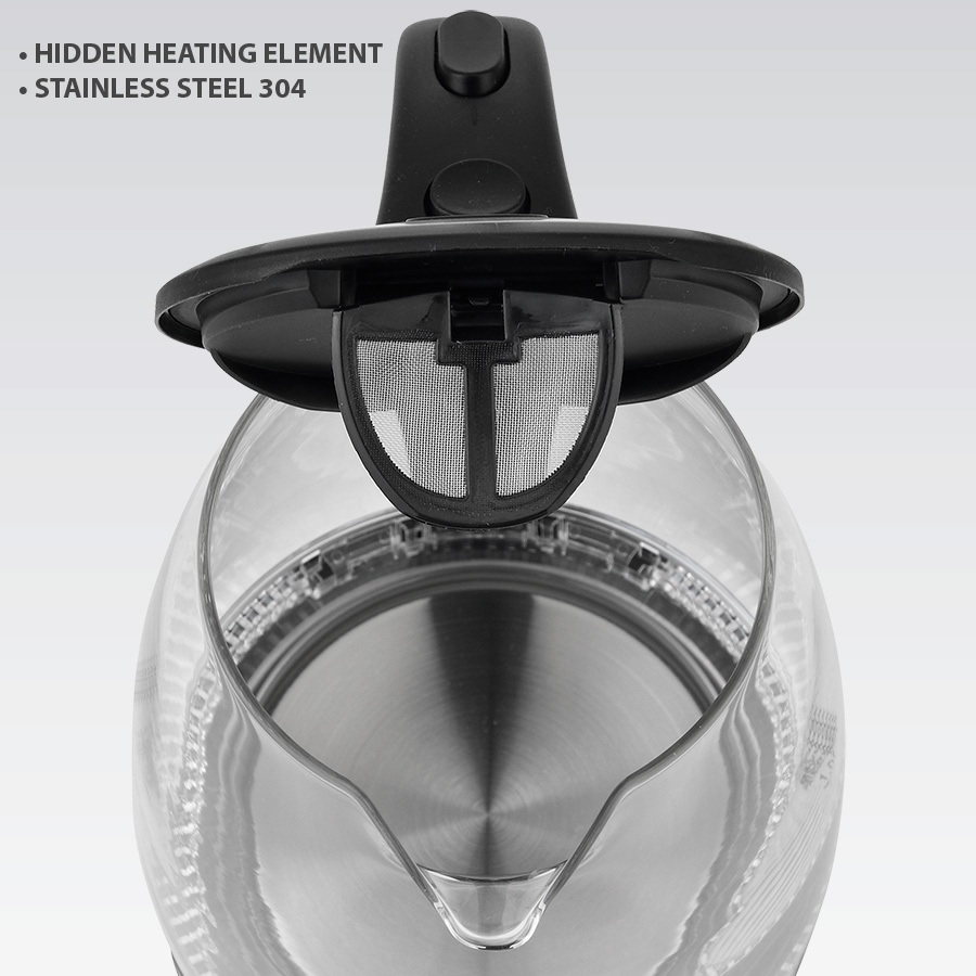Об'єм 1.7 л, потужність 2000 Вт, корпус термостійке скло, автоматичне вимкнення, прихований нагрівальний елемент, індикатор рівня води.