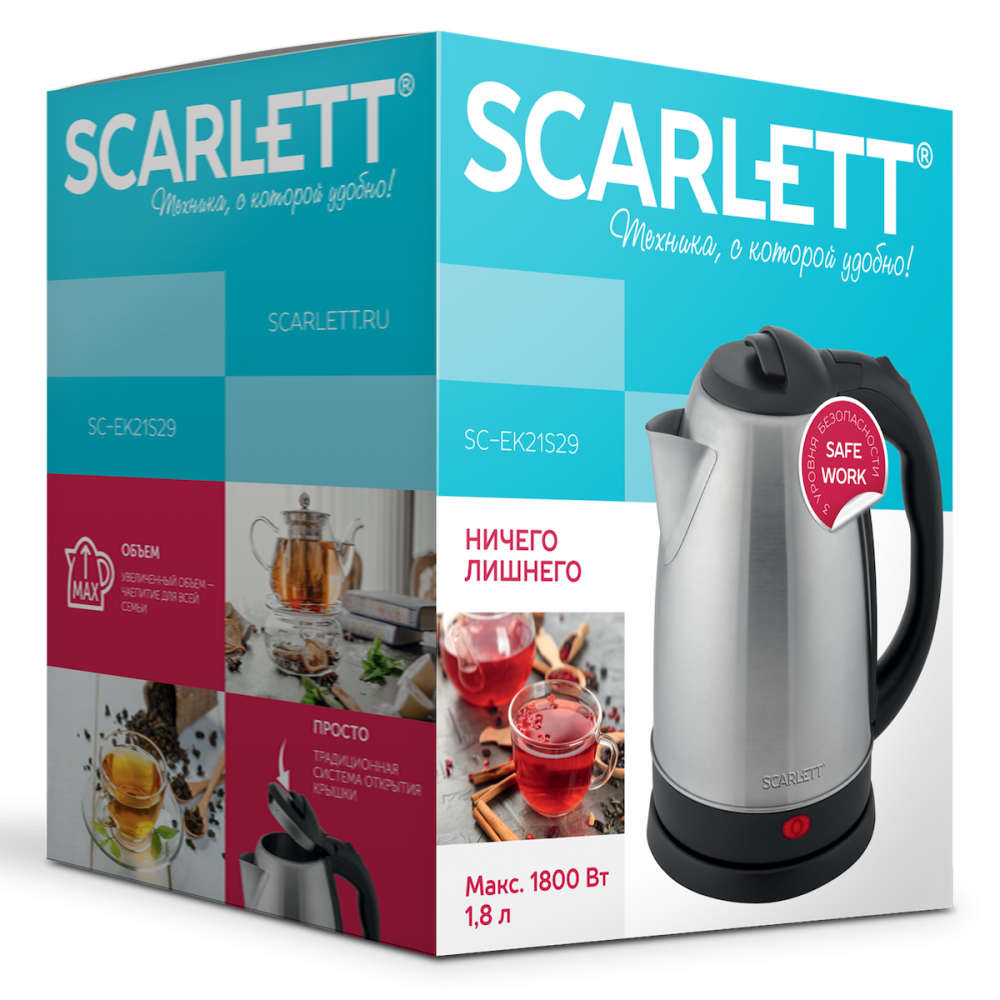 Мощность 1800 Вт, емкость 1.8 л, материал корпуса: нержавеющая сталь, закрытый нагревательный элемент, система многоуровневой безопасности «Safe Work», длина кабеля: 0.6 м