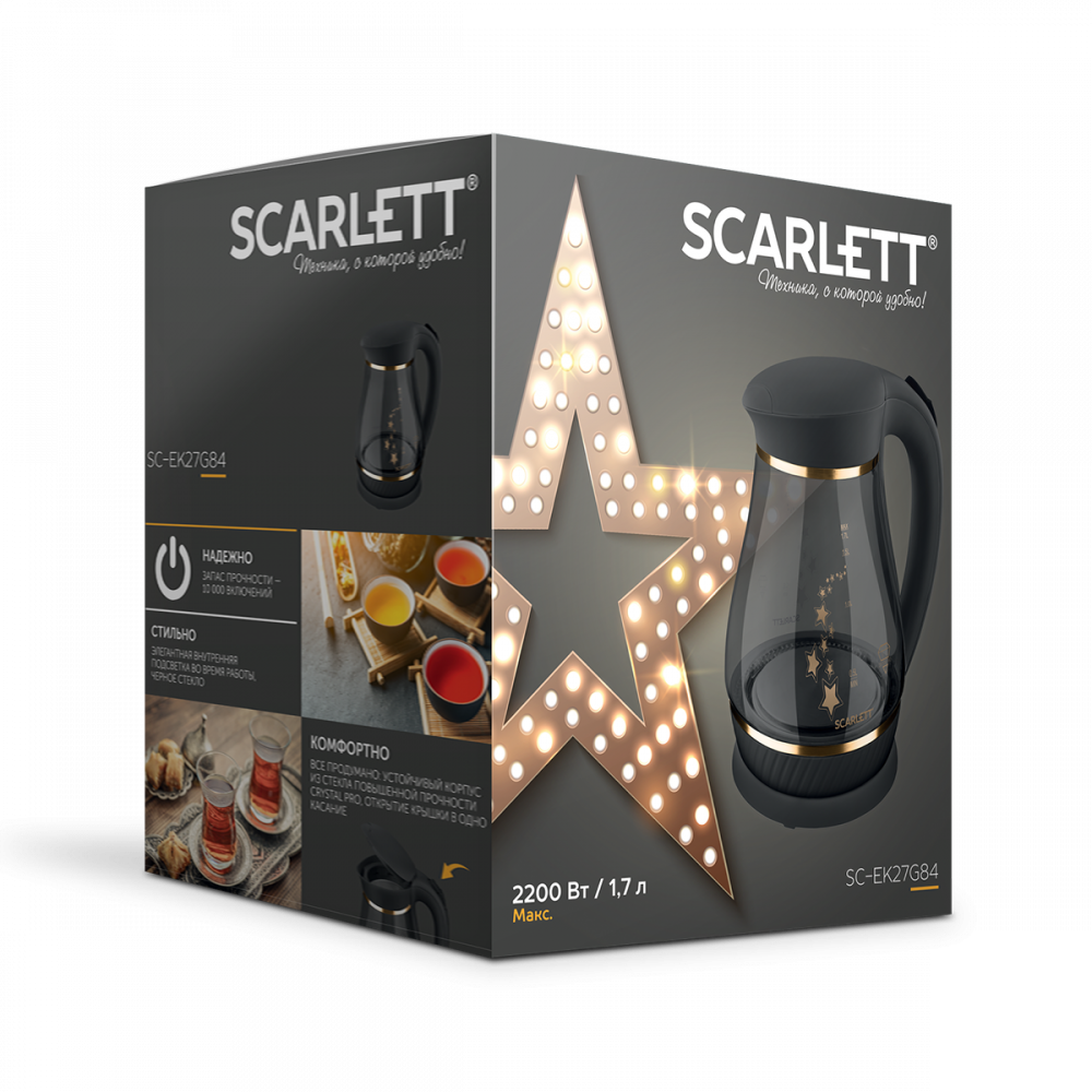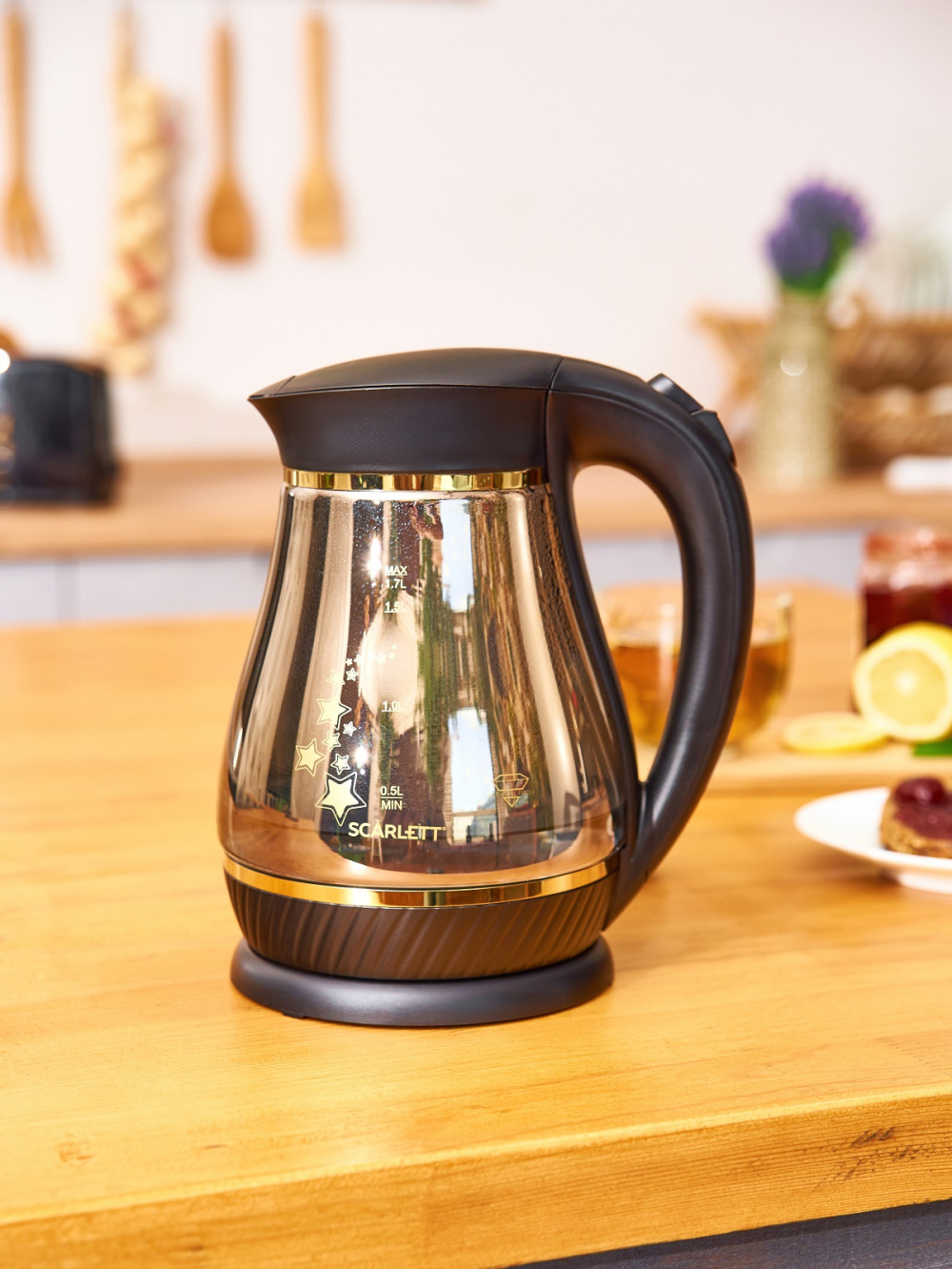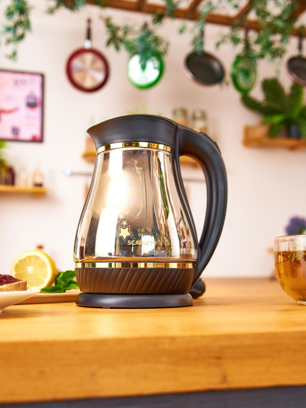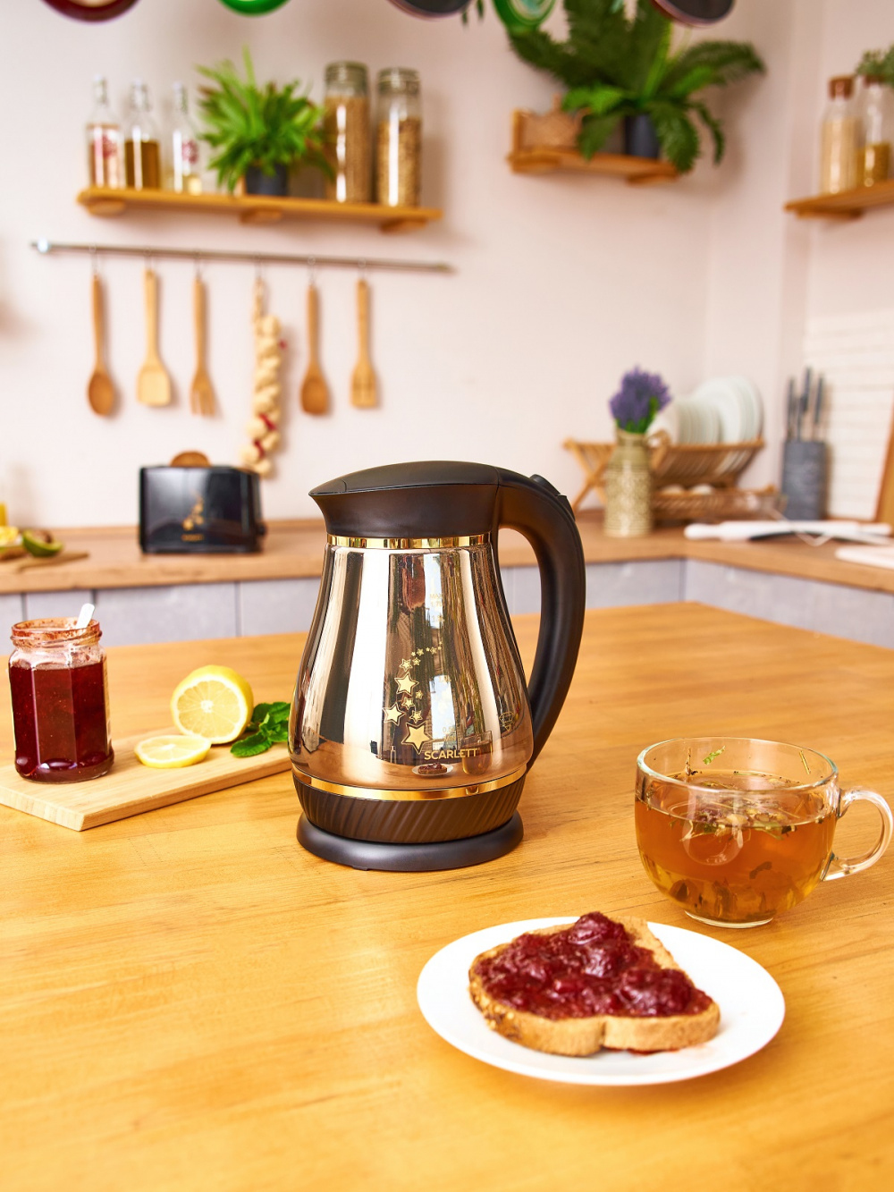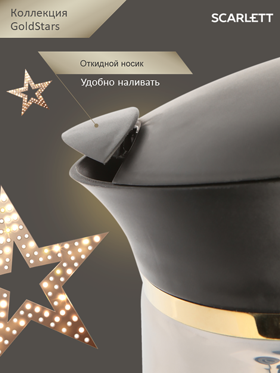 При выборе кухонной техники важны не только технические характеристики, но и дизайн. Ведь куда приятнее пользоваться красивыми вещами, которые подчеркивают особенности интерьера, вносят в обстановку изюминку и индивидуальность. Именно поэтому компания Scarlett создала электрический чайник SC-EK27G84, вошедший в стильную коллекцию Goldstars.