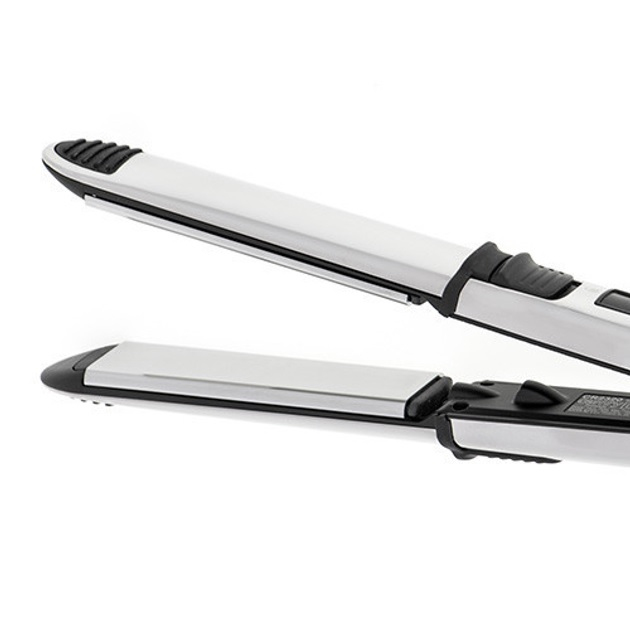 Потужність 50 Вт, LCD дисплей, 6 режимів температури: 130, 150, 170, 190, 210, 230°C, рухомі титанові пластини: 28x110 мм, корпус з нержавіючої сталі, автовимикання через 60 хвилин, наконечники, які не нагріваються, у комплекті: захисна рукавичка. Габаритні розміри: 30,5х3,5х4,5 см.