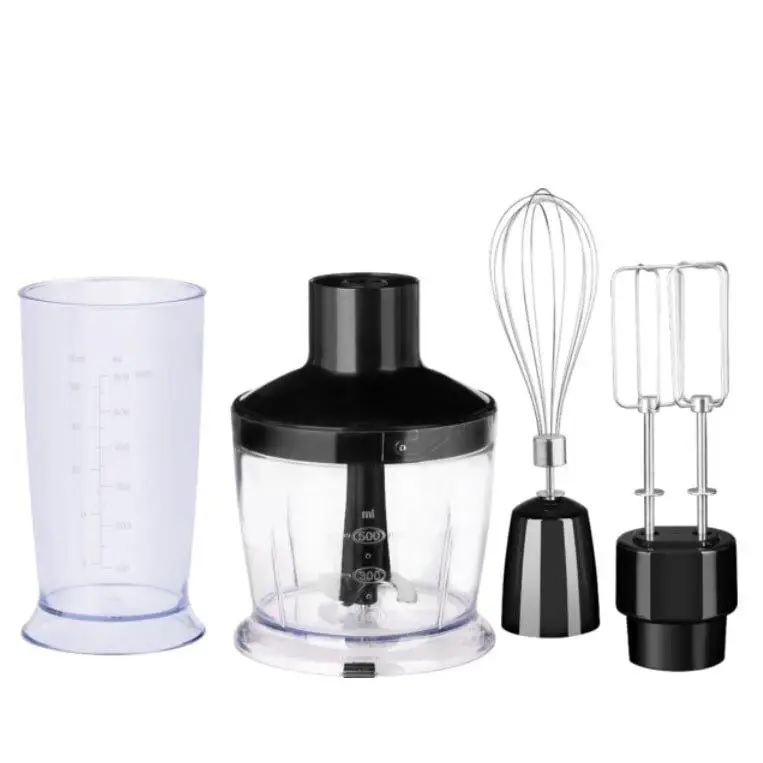 Потужність: 800 Вт, плавна регуляція швидкості, функція ніж із нержавіючої сталі з 4 лезами. До комплекту поставки входять (подрібнювач овочів з контейнером 500 мл, подвійний вінчик, вінчик дротяний, контейнер 600 мл).