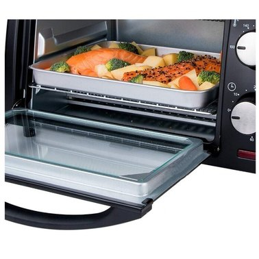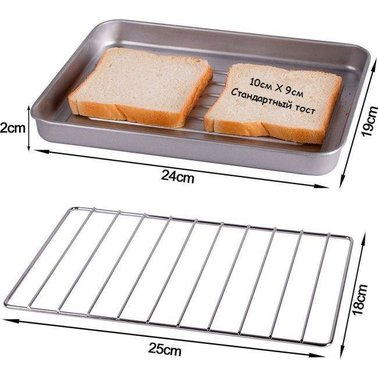 Потужність: 800 Вт, внутрішній об'єм: 10 л, таймер зі звуковим сигналом, регулятор температури, верхній і нижній нагрівальний елемент, дверцята - подвійне термостійке скло, розміри: 21x37x27, в комплекті: решітка і квадратне деко.