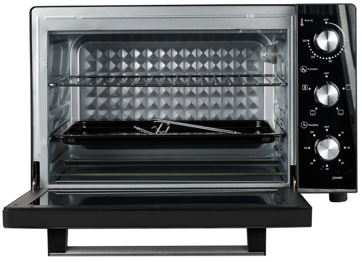 Об'єм: 60 л, потужність: 1900 Вт, таймер 60 хв, термостат (70°-250°С). Режими приготування: верхній нагрів, нижній нагрів, верхній+нижній нагрів, конвекція. Комплектація: деко, решітка, ручка для деко, лоток для крихт. Габарити: 580×472×412 мм.