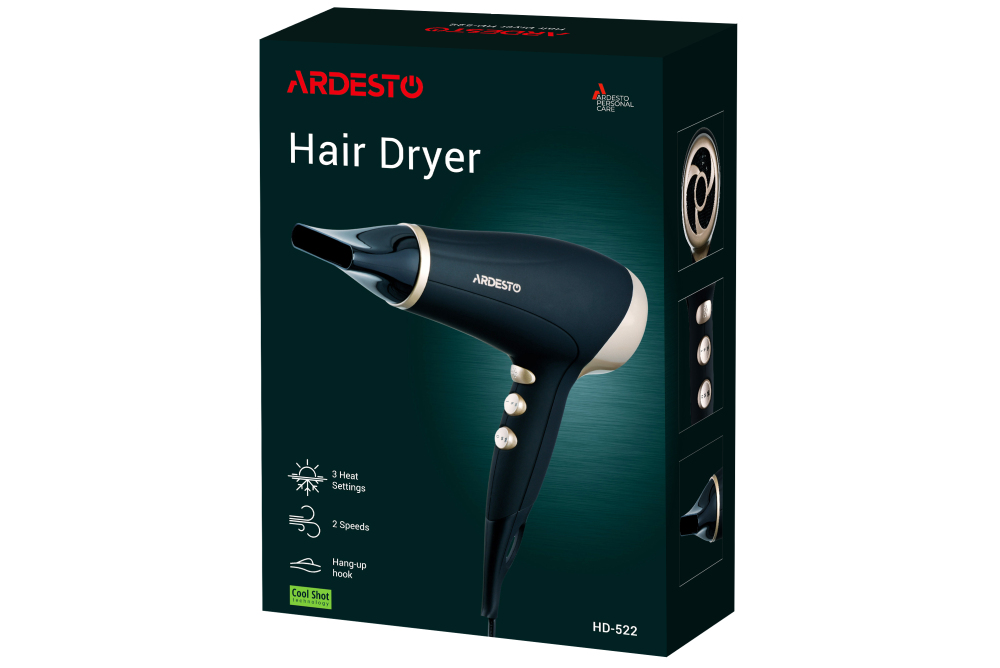 Потужність 2200 Вт, 2 швидкості, 3 температурних режими, функція холодного повітря, насадки: концентратор, дифузор, захист від перегріву.