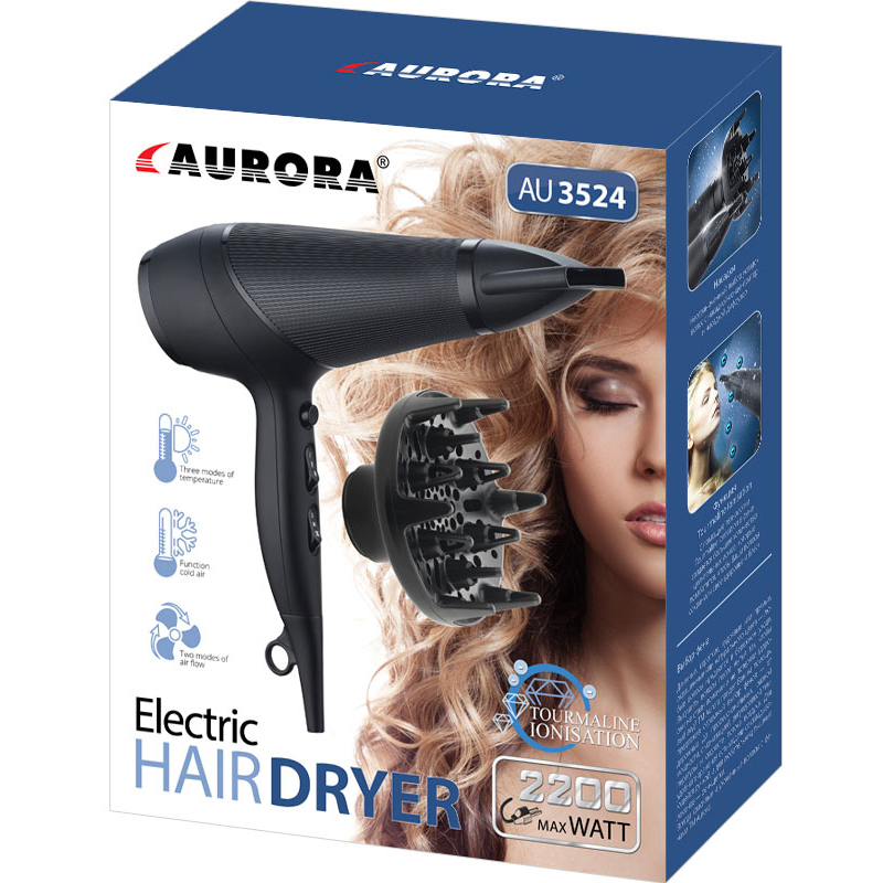 Фен AU3524 с большой мощностью 2200 Вт поможет сократить время сушки и облегчит создание укладки.