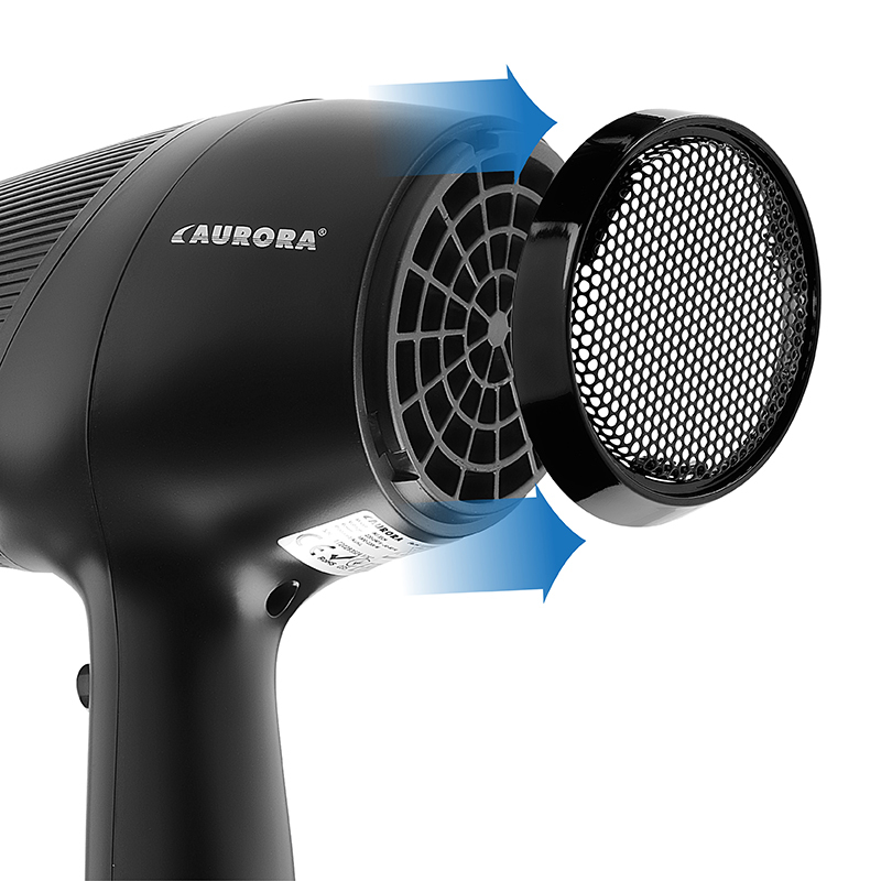 Съемный фильтр-сеточку легко снимать для очистки. Регулярная очистка препятствует скоплению пыли и волос, что продлевает эксплуатацию фена.