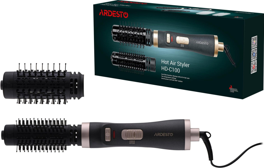 Фен-щітка Ardesto– стайлер для укладання локонів, який одночасно сушить волосся, потужністю 1 000 Вт. Пристрій має два температурні режими. У комплектації передбачено дві знімні насадки з керамічним покриттям діаметром 40 і 50 мм, які обертаються за та проти часової стрілки. Наявна функція Cool Shot, холодний обдув. Додає зручності під час користування шнур живлення з обертанням на 360°. Аби стати власницею красивої укладки, не обов’язково відвідувати салон. Із феном-щіткою Ardesto HD-C100 можна з легкістю робити зачіску самостійно.