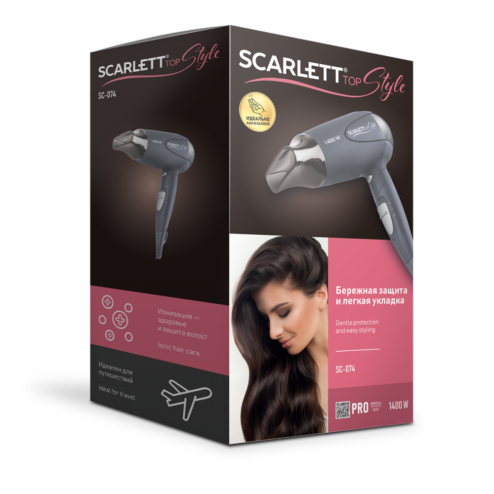 Фен Scarlett TOP STYLE SC-074 выполненный в нежных тонах, станет лучшим решением для всевозможных поездок - благодаря складной ручке он почти не занимает места в чемодане.