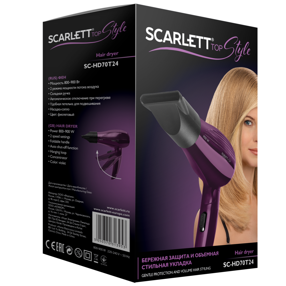 Scarlett SC-HD70T24 компактный, удобный в использовании фен с узким концентратором для сушки и укладки волос.