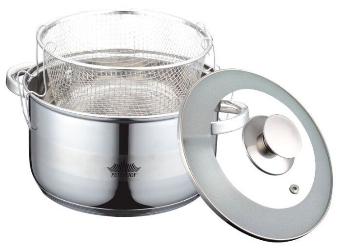 Кастрюля с сеткой для фритюра Peterhof диаметром 24 см и объемом 6,5 л из нержавеющей стали способна служить долгие годы. Многослойная конструкция дна защищает пищу от пригорания и сохраняет высокую температуру некоторое время после окончания термического воздействия.