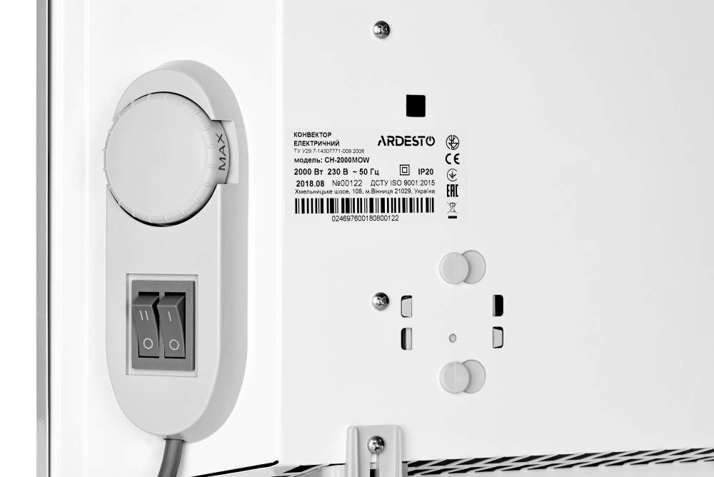 Ardesto CH-2000MOW использует надежные комплектующие – закрытый оребренный нагревательный элемент немецкой компании Eihenauer, а также итальянский высокоточный биметаллический термостат. Отсутствие движущихся компонентов и продуманная конструкция полностью исключает любые шумы при работе. Механическое управление состоит из клавиши включения с защитной накладкой и поворотного регулятора мощности. Конвекторы Ardesto поддерживают два типа монтажа – настенный и напольный. Кронштейны и опоры поставляются в комплекте с обогревателем.