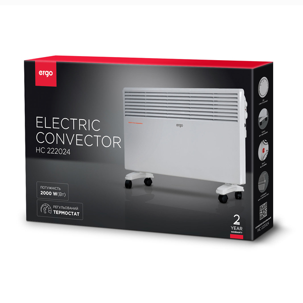 Електричні конвектори ERGO призначені як для основного, так і для додаткового обігріву приміщень. При використанні конвекторів як основного джерела обігріву, прилад встановлюються стаціонарно на стіні за допомогою кронштейнів. При використанні конвекторів для додаткового обігріву прилад може бути встановлений на колісні платформи. І кронштейни, і колісні платформи входять до комплекту постачання обігрівача. Вони відрізняються високим ККД за рахунок застосування Х-подібного алюмінієвого нагрівального елемента з великою площею теплообміну та раціональної конструкції приладу, що дозволяє ефективно спрямовувати повітряний потік на нагрівальний елемент.