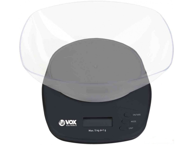 Максимальна вага: 5 кг, РК-екран, одиниці виміру: грами, кілограми, фунти, унції, чаша: знімна, корпус: пластик, точність вимірювання: 1 г, функція тарування, індикація перевантаження і низького заряду батарей, підсвітка екрану, живлення: 2 батарейки типу ААА (у комплект не входять)