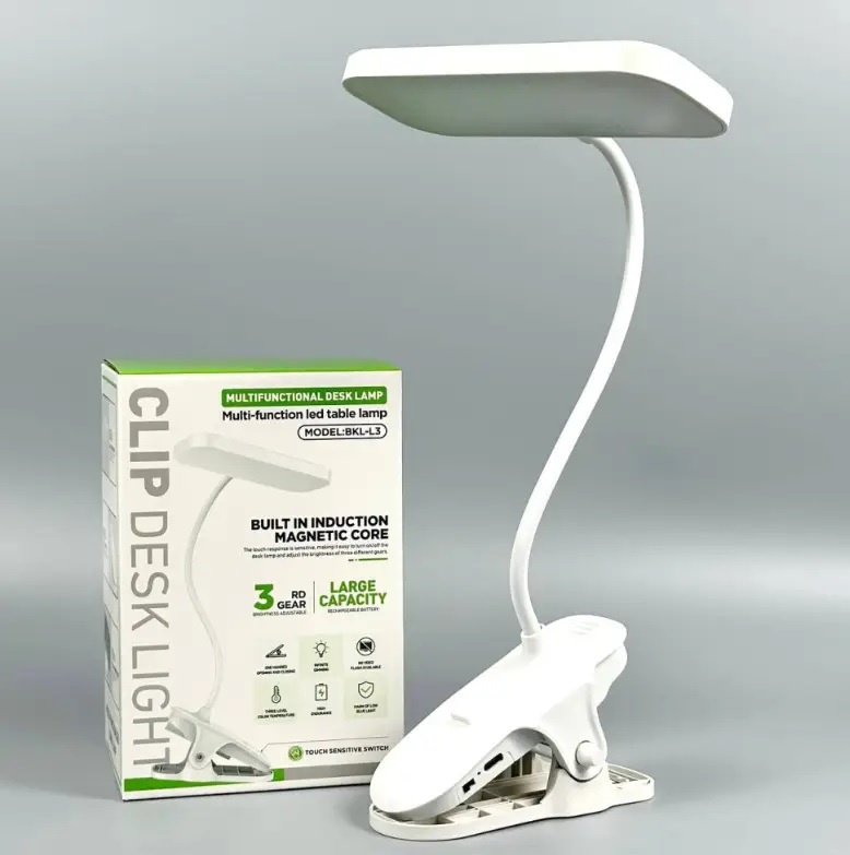 Настільна лампа BKL-L3 — це компактне та універсальне освітлення для роботи, навчання або читання. Модель обладнана зручною кліпсою, завдяки якій її можна закріпити на столі, полиці, узголів’ї ліжка чи ноутбуці. Гнучка ніжка довжиною 30 см дозволяє точно налаштувати напрямок світла. Лампа має 3 режими освітлення та плавне регулювання яскравості, що робить її комфортною для очей у будь-яких умовах.