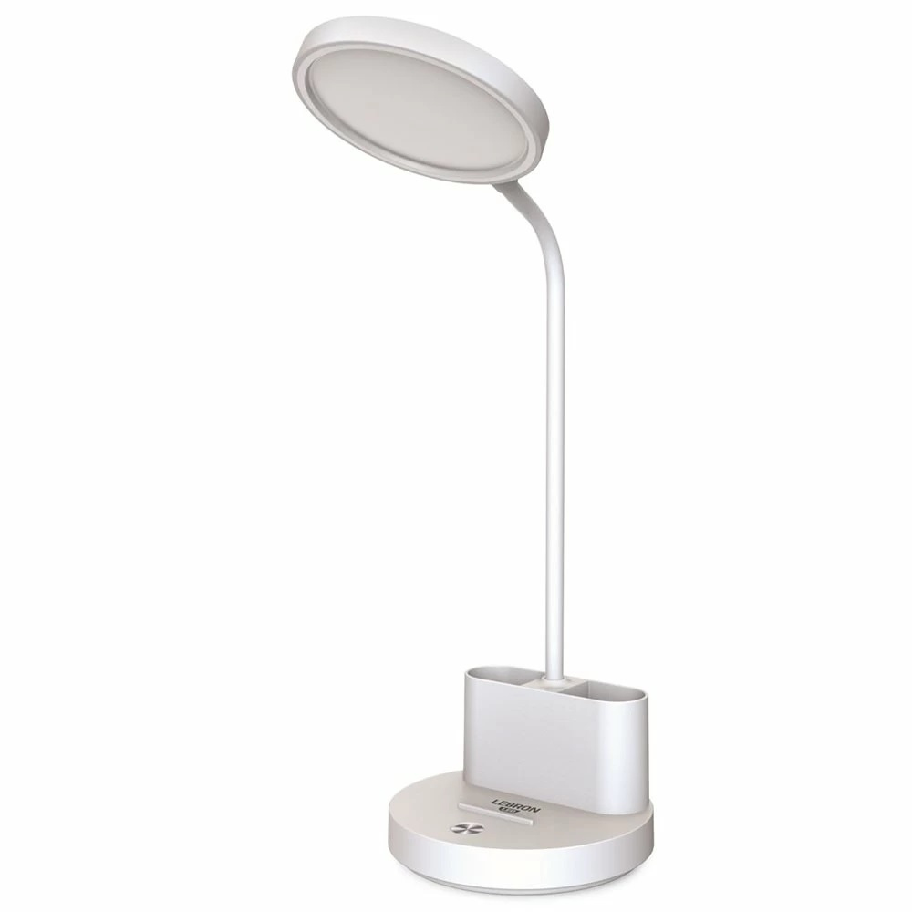 Світлодіодна настільна лампа Lebron з підставкою для канцелярії та телефону має лаконічний та стриманий дизайн, виконаний у класичному білому кольорі. Підійде до будь-якого інтер'єру, тому є універсальним рішенням для освітлення.