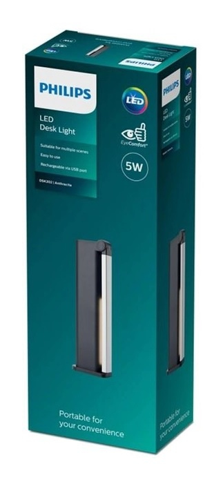 Настільна лампа, сенсорне управління, потужність 5W, світловий потік 120 Лм, температура світла: 4000К, індекс кольору (CRI): 80, живлення: акумулятор 1800Mah, мережа 220В, розміри: 245х39х292.