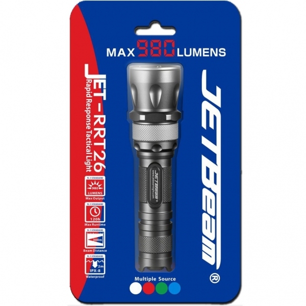 Мощный светодиодный фонарь JetBeam RRT-26 для тактического и ежедневного применения, способный обеспечить яркость свечения 980 Люмен и дальность луча до 300 метров. Такая эффективность светового потока достигается благодаря современному светодиода Cree XM-L2 и высококачественной оптической системы с гладким алюминиевым рефлектором и оптическом закаленному стеклом с антибликовым покрытием. Стоит отметить, что ресурс работы диода более 5 лет непрерывного свечения.