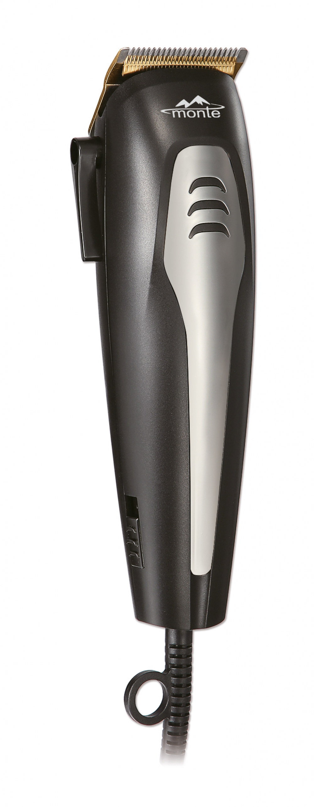 Питание от сети, лезвия с титановым покрытием, мощность: 15 Вт, 4 насадки: 3 мм, 6 мм, 9 мм, 12 мм, ножницы, расческа, щеточка для чистки, масло