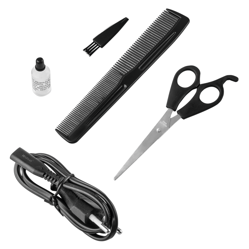 Тип: 2 в 1 - стрижка волос и бороды, 6-ти позиционный телескопический гребень, функция филировки, длина стрижки: 1—17 мм, материал лезвия: нержавеющая сталь, мощность: 2 Вт, питание: аккумулятор, время работы: 50 мин, возможность влажной чистки, щетка для чистки машинки, масло