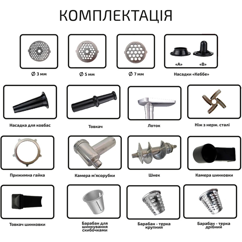 За допомогою набору аксесуарів, що входять до комплекту: 3 решітки для різного перемелювання м'яса, 3 барабани для нарізки та шаткування, насадки для ковбас та кеббе, можна швидко і легко приготувати безліч рецептів.