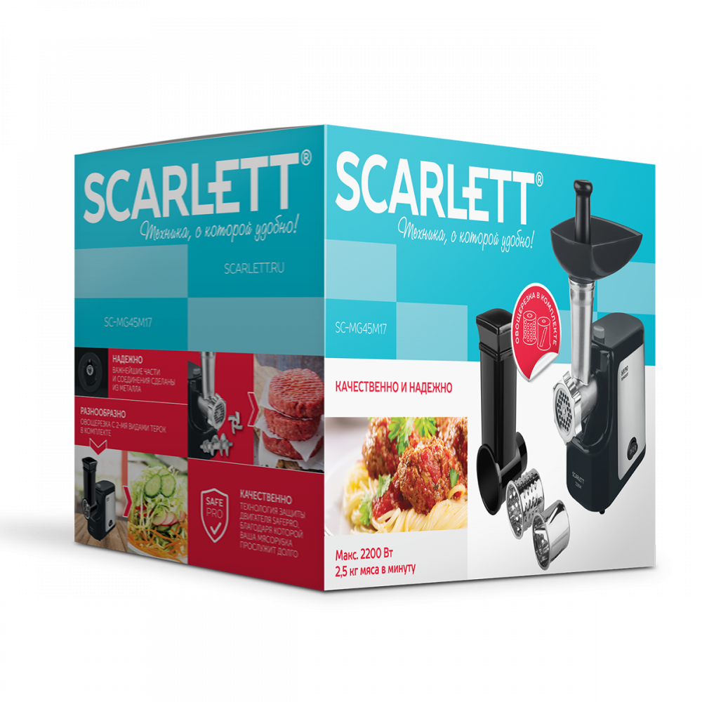Компактная, мощная и многофункциональная мясорубка SC-MG45M17 ― надежный помощник на Вашей кухне. Высокая мощность мотора мясорубки позволяет перерабатывать любое мясо в однородный фарш, а производительность модели достигает 2.5 кг/ мин. В комплекте 6 насадок: 2 перфорированные решетки с отверстиями 5 и 7 мм, насадки для кеббе и для приготовления домашней колбасы, овощерезка с крупной теркой и шинковка. Высокопрочный металлический шнек и нож из высококачественной нержавеющей стали обладают повышенной износостойкостью, тем самым повышая эффективность работы и продлевая срок службы прибора. Технология SAFE PRO позволяет предотвратить перегрев и перегрузку двигателя, тем самым продлевая срок его эксплуатации. Функция «Реверс» позволяет прокручивать мясо в обратном направлении, в случае если оно застряло. Процесс разборки мясорубки занимает минимальное время: достаточно нажать кнопку отсоединения горловины и отделить все металлические части друг от друга. В данной модели прекрасно сочетаются компактный размер и легкий вес мясорубки. Стильный и лаконичный дизайн мясорубки SC-MG45M17 идеально подойдет для Вашей кухни.