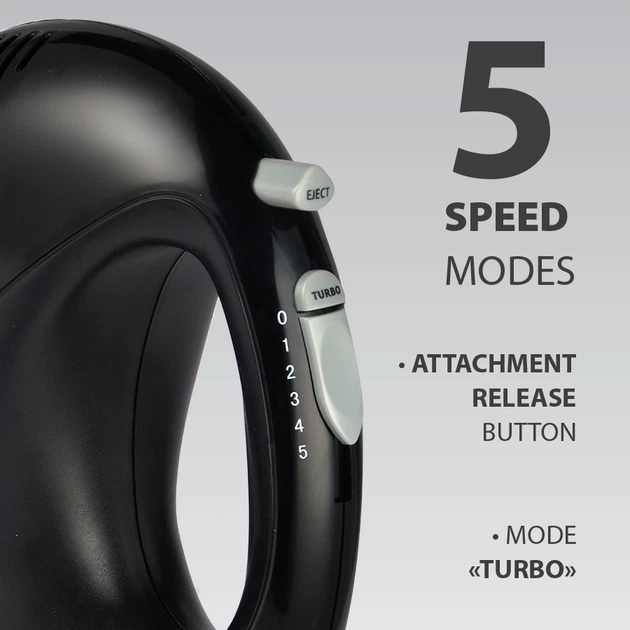 Потужність: 600 Вт, кількість швидкостей 5, режим «Turbo», насадки: вінчики; гаки для тіста