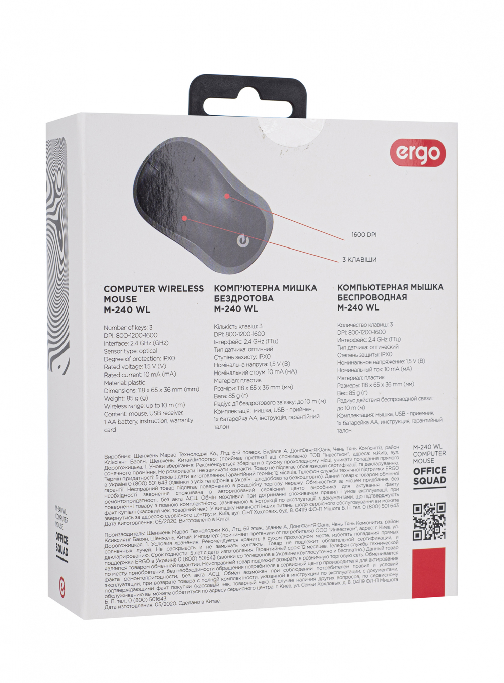 Оптическая беспроводная мышь ERGO М-240 WL выполнена из прочного пластика и имеет классический дизайн, благодаря чему подойдет к офисному или домашнему интерьеру. Удобная конструкция позволяет проводить за компьютерной работой больше времени, не испытывая дискомфорта, а отсутствие лишних проводов освобождает место на рабочем столе и облегчает управление аксессуаром.