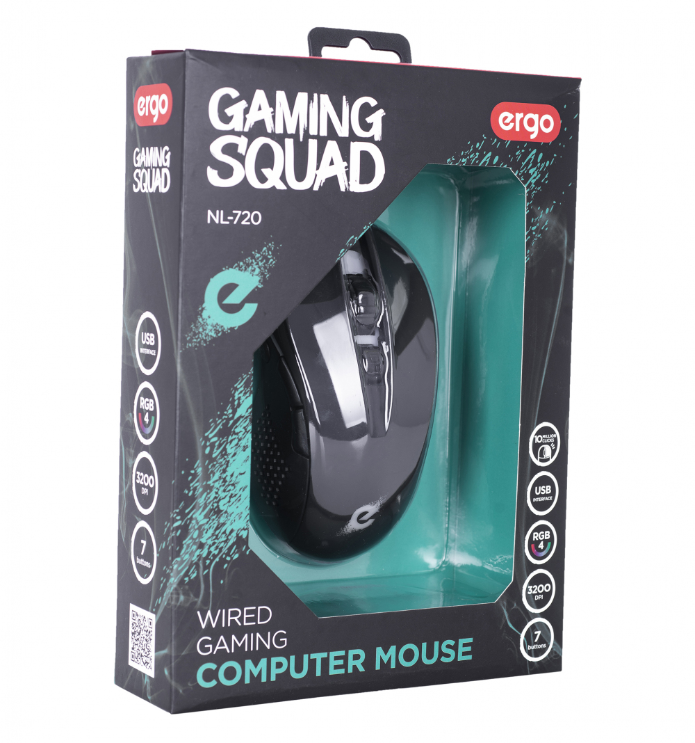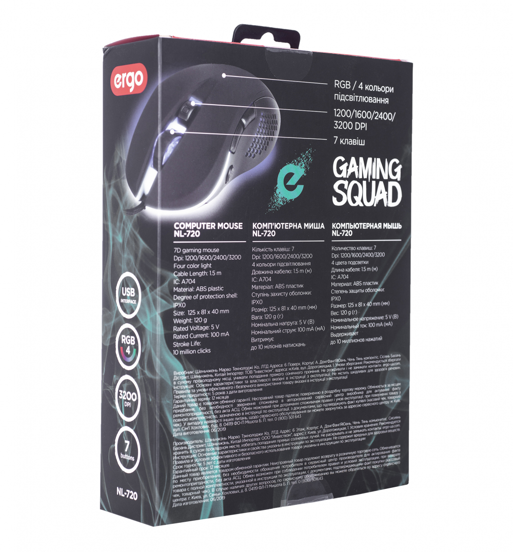 Оптическая мышь ERGO NL-720 выполнена из ABS-пластика со специальным покрытием, благодаря которому рука не скользит и надежно контролирует устройство. Манипулятор оснащен семицветной подсветкой, которая обеспечивает комфортную игру даже ночью.