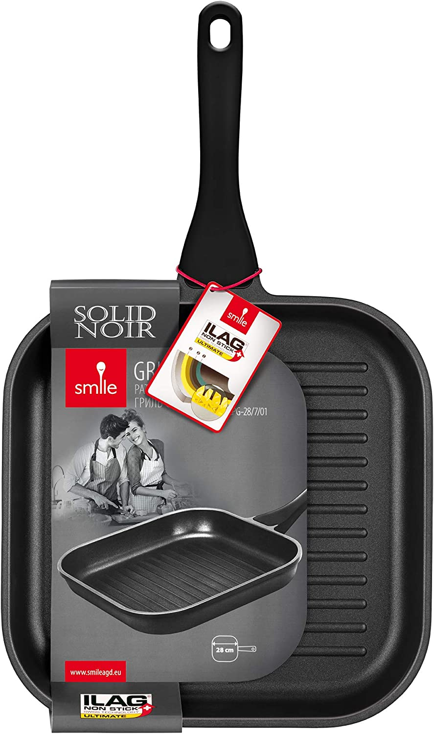 Сковорода Smile MPG-28/7/01 виготовлена з алюмінію та з внутрішнім покриттям Ilag Ultimate, перевага якого - мала вага і відмінна теплопровідність, а антипригарне покриття позбавить вас від пригорання. Ергономічна бакелітова ручка на клёпочном з'єднанні. Підходить для всіх типів плит, можна мити у посудомийці. Розміри: 28Х28 см.