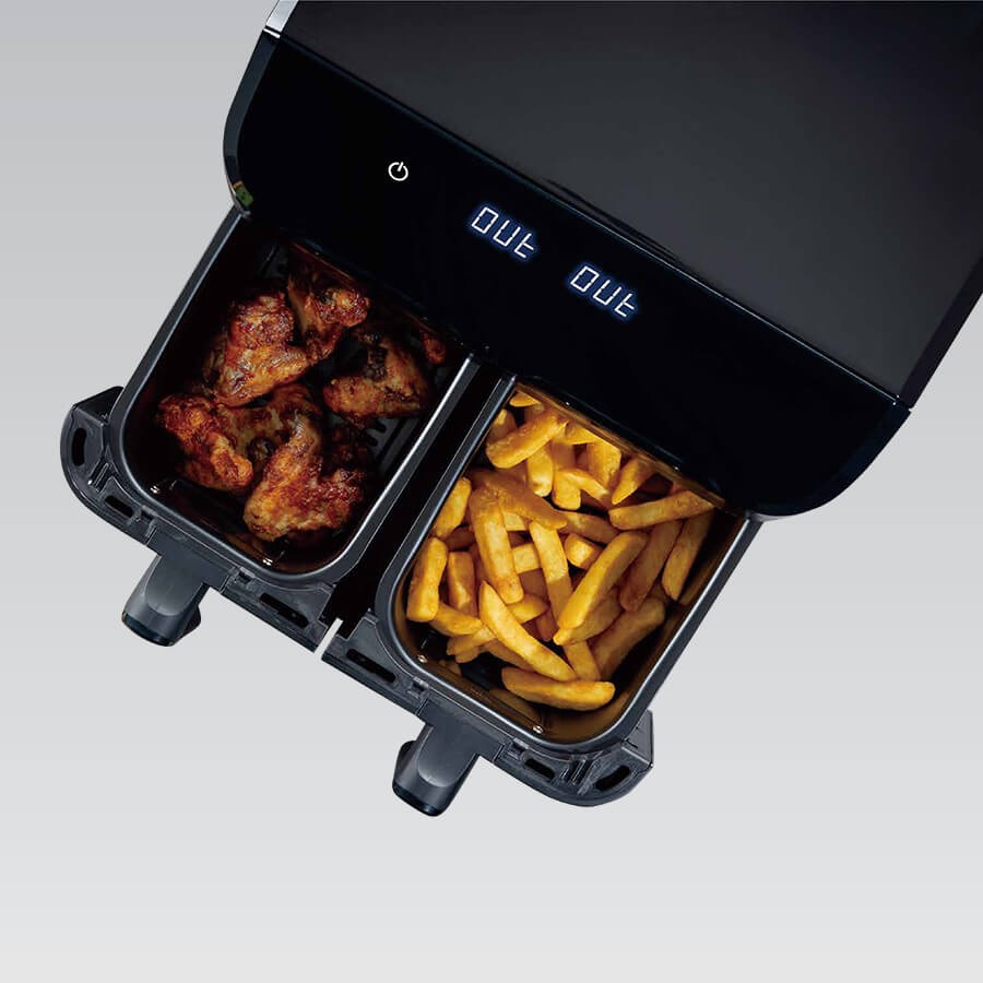 Потужність: 2000 Вт, LED дисплей, 2 незалежні чаші об'ємом 4,5 л + 4,5 л, 8 програм приготування, регульована температура 80°C-200°C, таймер автоматичного вимкнення на 30 хвилин, матеріал корпусу: пластик. Особливості:  захист від перегріву, автоматичне відключення після завершення процесу приготування.