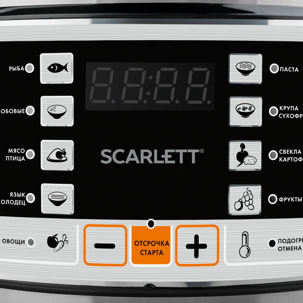 В мультиварке-скороварке SC-MC410Р02 есть программа Отсрочка старта 24 часа для приготовления Ваших любимых блюд к заданному времени: просто выложите нужные продукты в чашу, установите время, и готовое блюдо будет радовать Вас на завтрак, обед или ужин.