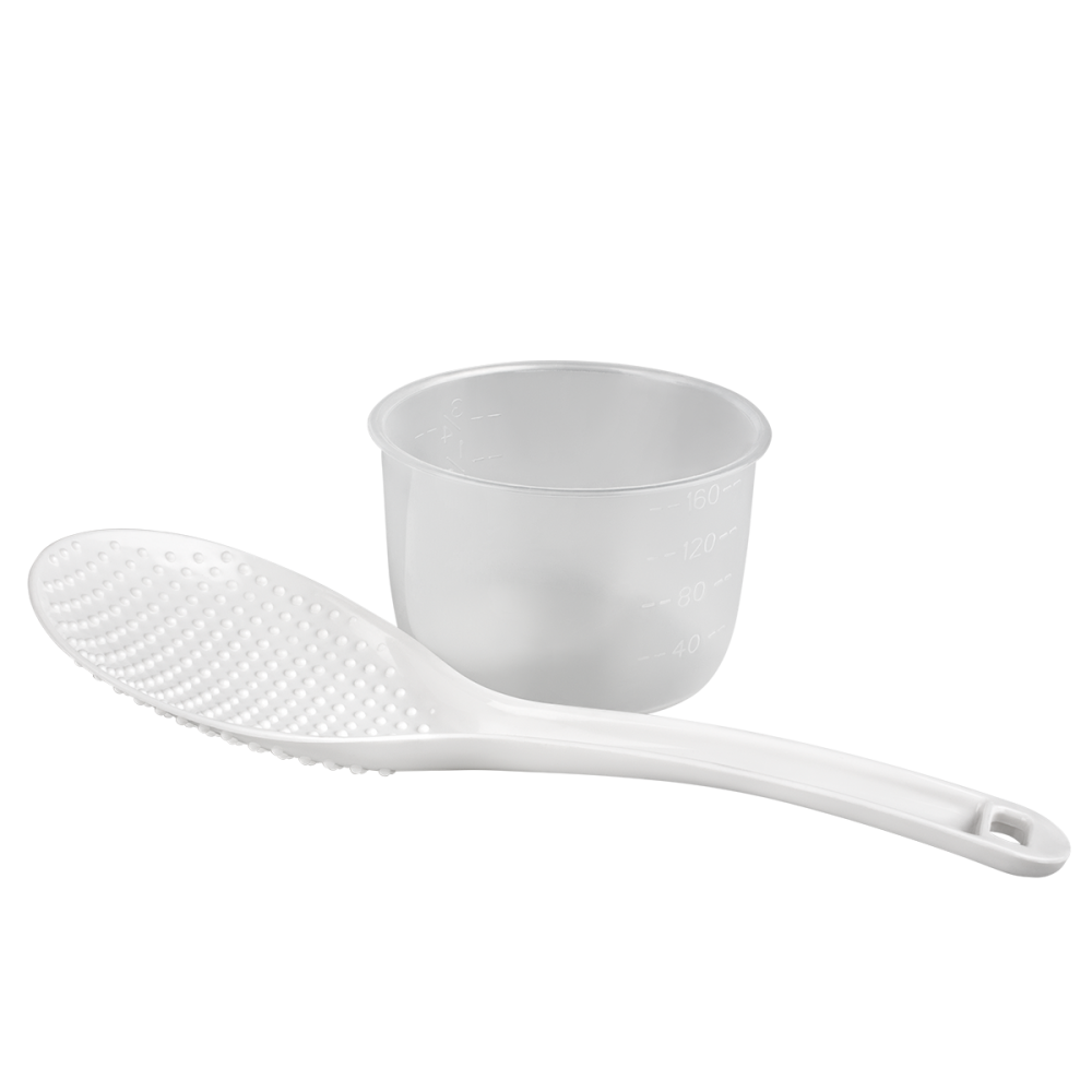 Ложка для перемешивания, мерный стакан и книга рецептов в комплекте.