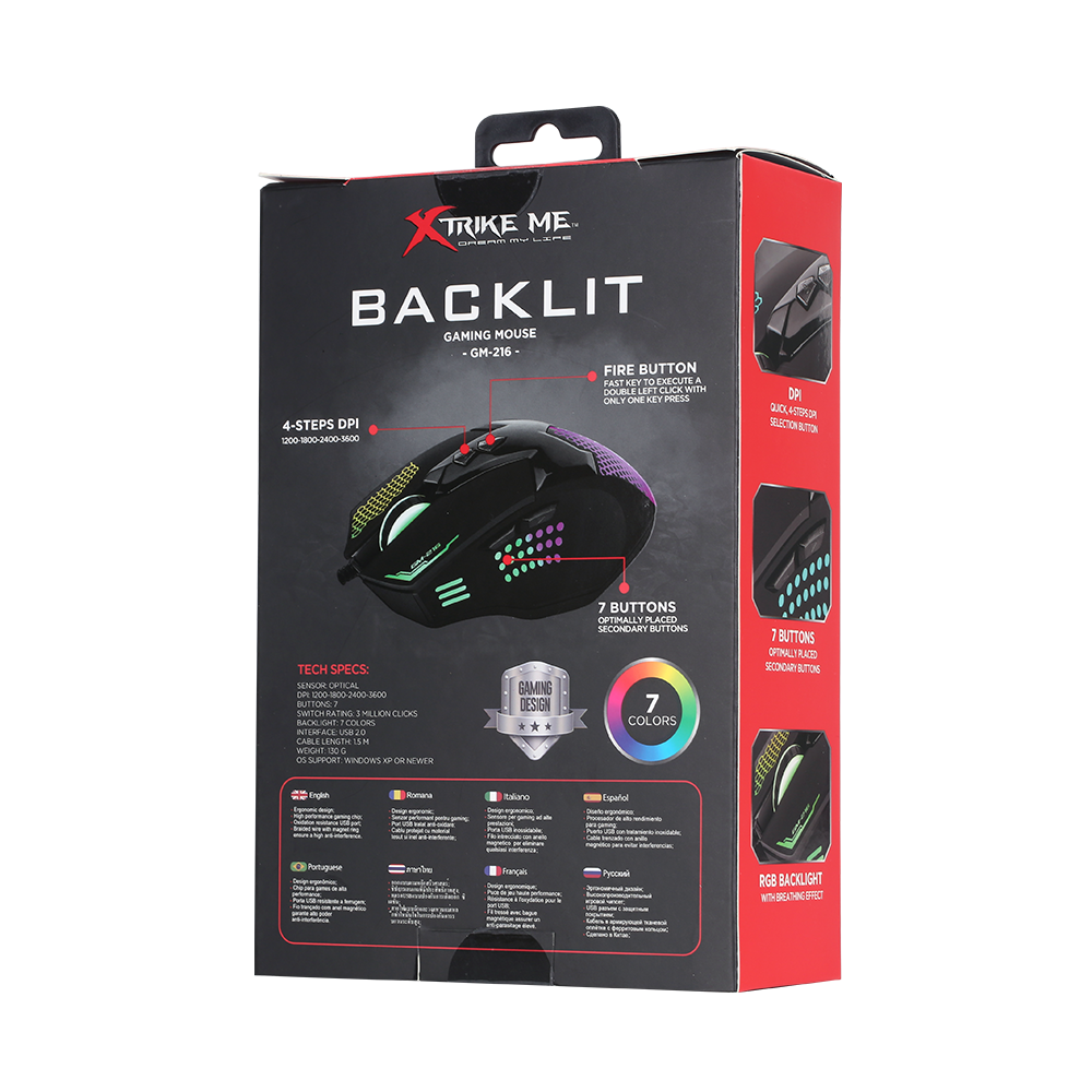 Тип подключения: проводная (USB), мышь - игровая, тип сенсора - оптический, 7 кнопок, имеются кнопки вперед и назад, подсветка (7 различных цветов), разрешение 1200-1800-2400-3600 DPI, срок службы: 3000000 нажатий, длина кабеля: 1.5 м, в комплекте коврик, размер коврика: 230x200x2 мм