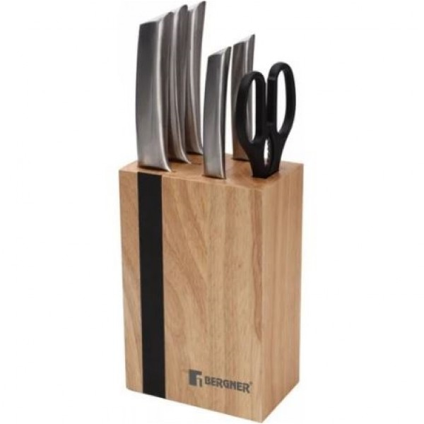 Набор ножей Bergner Keops Steel состоит из 7 предметов – 5 ножей разного назначения, кухонных ножниц и деревянной подставки. Лезвия ножей изготовлены из нержавеющей стали. Можно мыть в посудомоечной машине.